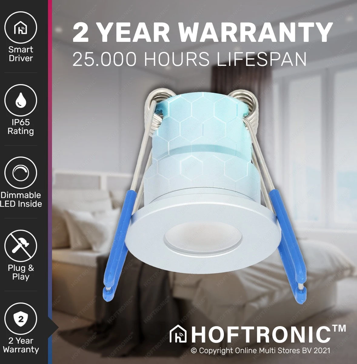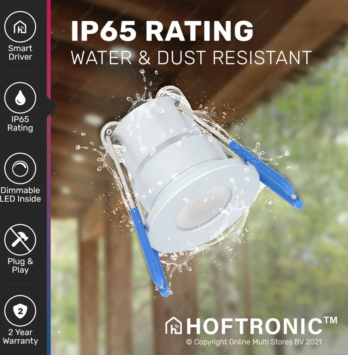 - Smart assistent: Via de gratis Hoftronic Smart app koppel je deze spotjes razendsnel aan je slimme assistent. Zo bedien je de inbouwspots met je stem: “Oké Google, zet de verlichting in mijn veranda aan”. Ondersteunde slimme assistenten zijn: Google Home, Amazon Alexa en Siri