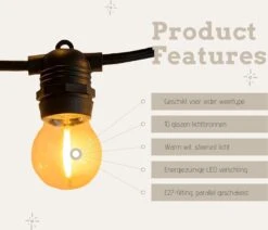 Eindig je dag goed met deze sfeervolle verlichting. Of je nou lekker even in de tuin of op je balkon wilt ontspannen, een leuk feestje wilt geven of de voortent van de caravan wilt voorzien van leuke verlichting, dit lichtsnoer is een echte eyecatcher. Geniet van een gezellige sfeer dankzij de 10 glazen LED lichtbronnen met warm wit licht. Regenachtige dagen? Geen enkel probleem. De lichtbronnen zijn namelijk geheel waterbestendig.