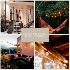 Eindig je dag goed met deze sfeervolle verlichting. Of je nou lekker even in de tuin of op je balkon wilt ontspannen, een leuk feestje wilt geven of de voortent van de caravan wilt voorzien van leuke verlichting, dit lichtsnoer is een echte eyecatcher. Geniet van een gezellige sfeer dankzij de 25 (+2 gratis reserve) glazen LED lampjes met warm wit licht. Regenachtige dagen? Geen enkel probleem. De lampjes zijn namelijk geheel waterbestendig.