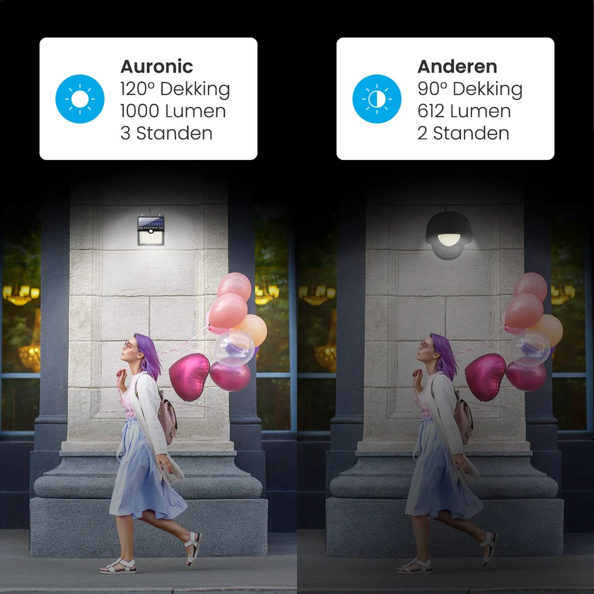 Met de solar lamp van Auronic geniet je van meer licht en een groter lichtbereik. De 97 LED lampen met 1000 Lumen geven bovengemiddeld veel licht af. Kies uit drie verschillende lichtstanden: 12 uur op medium stand zonder sensor, dim naar fel met sensor, uit naar fel met sensor. Met onze 4-pack verlicht je het gehele gewenste oppervlak met één druk op de knop!