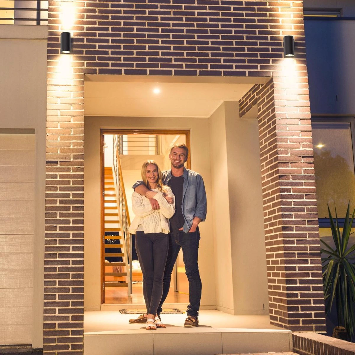 De buitenlamp is voorzien van twee GU10 fittingen. De GU10 lichtbronnen zijn inbegrepen. Zo ontstaat het unieke Up Down Light. Met 800 lumen stralen de GU10-lampen naar boven en beneden en creëren zo een modern op en neer effect als blikvanger op uw huismuur of trap.