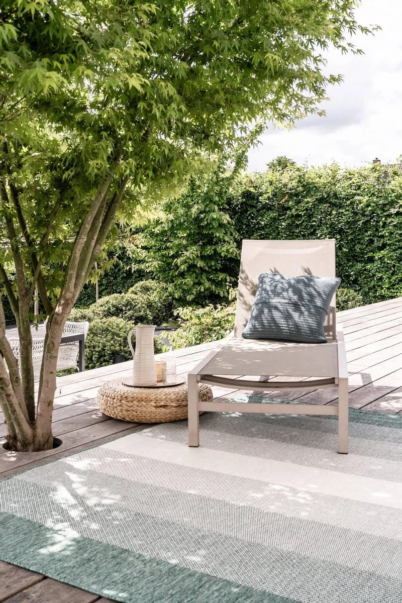 Wat leuk is aan de buitenvloerkleden van Eva Interior is dat ze dubbelzijdig te gebruiken zijn, in een handomdraai heb jij dus een totaal ander kleed met tegengestelde kleuren!