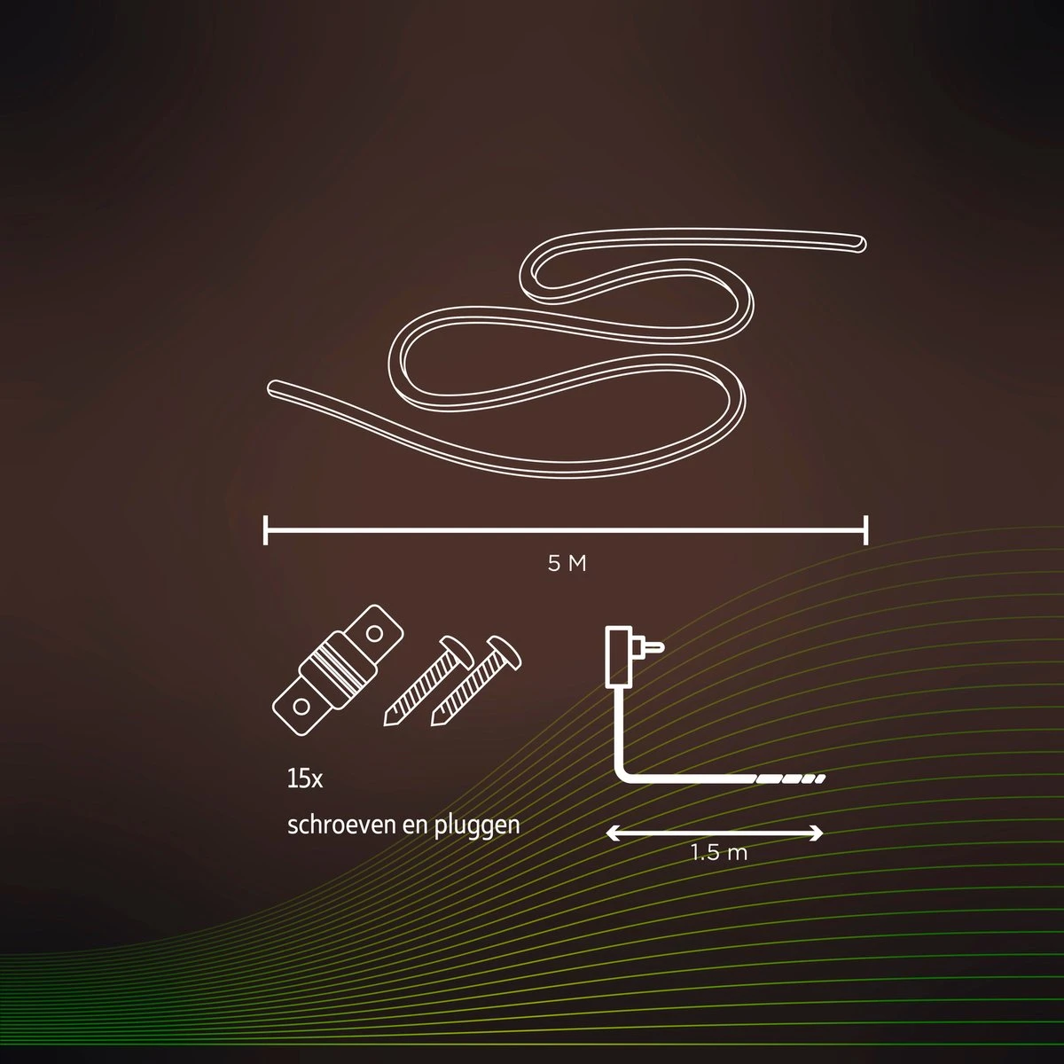 Met deze slimme buiten led-strip creëer je de perfecte sfeer in jouw tuin! Door middel van de gratis Calex App is deze smart led strip draadloos te bedienen, ook wanneer je zelf niet thuis bent. Accentueer en verlicht onderdelen in jouw tuin en geniet van warm wit licht met 16 miljoen extra kleuropties. Natuurlijk komt deze buitenverlichting ook goed tot zijn recht op jouw balkon of terras! Let op: voor deze tuinlamp heb je een Calex Bluetooth Link nodig, die zal zorgen voor optimale verbinding van jouw buitencollectie.