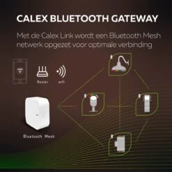 Het WiFi bereik in de tuin is vaak niet toereikend. Daarom zijn alle producten in deze serie onderling met elkaar verbonden door middel van een Bluetooth verbinding. Deze verbinding wordt gecreëerd door de Bluetooth Link en is stabiel, ongeacht de grootte van je tuin of het aantal geplaatste producten. Voor optimaal gebruik van de Calex’ buitenverlichting dient u dus de Calex Link aan te schaffen. De Calex Link pikt de lokale wifiverbinding (2.4 GHz) op en verspreidt deze middels de Bluetooth Link met minimaal één device in de tuin. Aan deze Link kunnen meerdere slimme buitenlampen en led strips gekoppeld worden, die allemaal controleerbaar zullen zijn in de App.