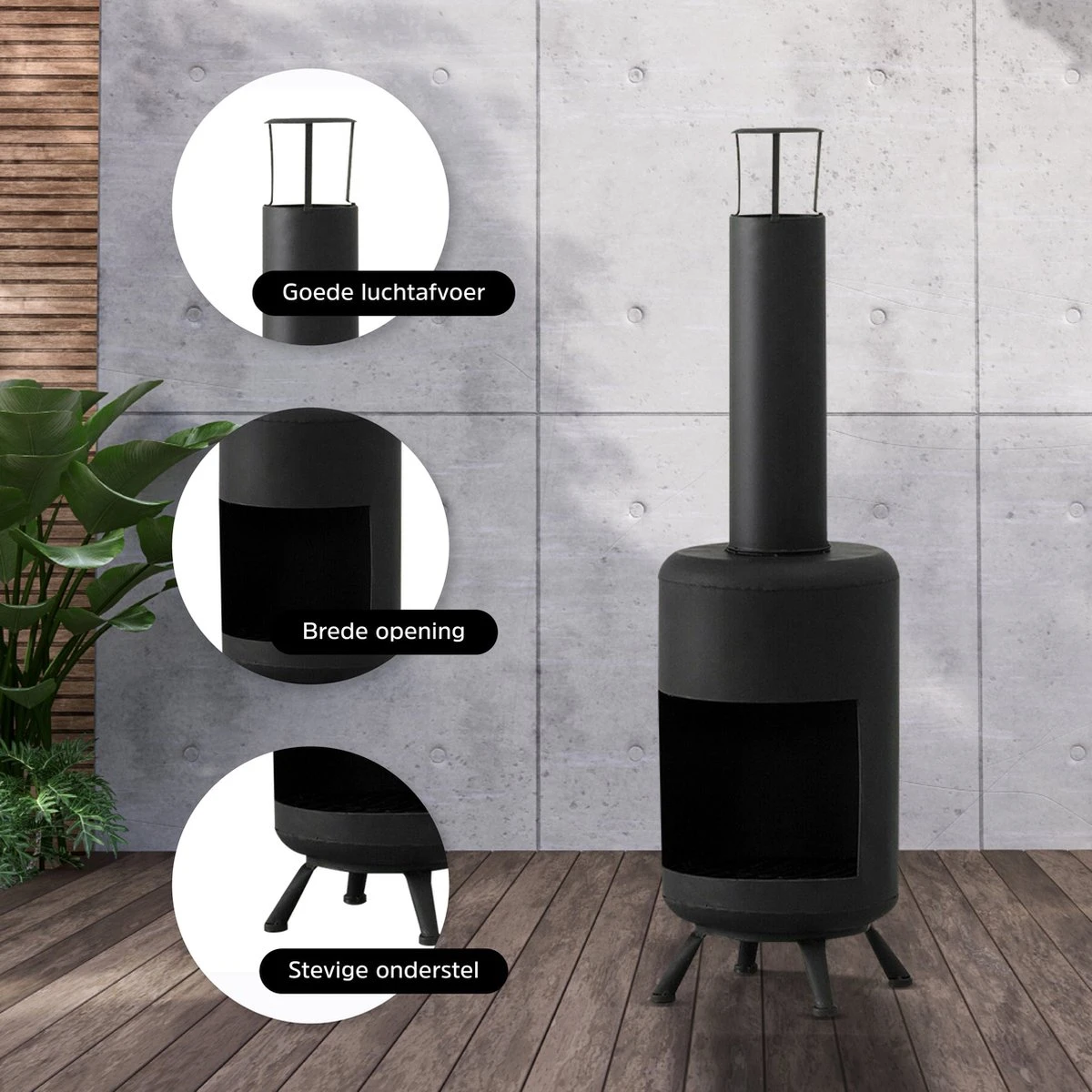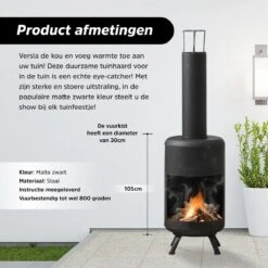 Deze Cheqo terraskachel is een eyecatcher in elke tuin! De metalen haard is 105 centimeter hoog en heeft een diameter van 30 centimeter. Door zijn stoere zwarte uiterlijk is dit de perfecte kachel om mooie zomeravonden nog specialer te maken. Wacht dus niet langer en haal snel deze mooie terrashaard in huis om optimaal te genieten van een sfeervolle zomer!