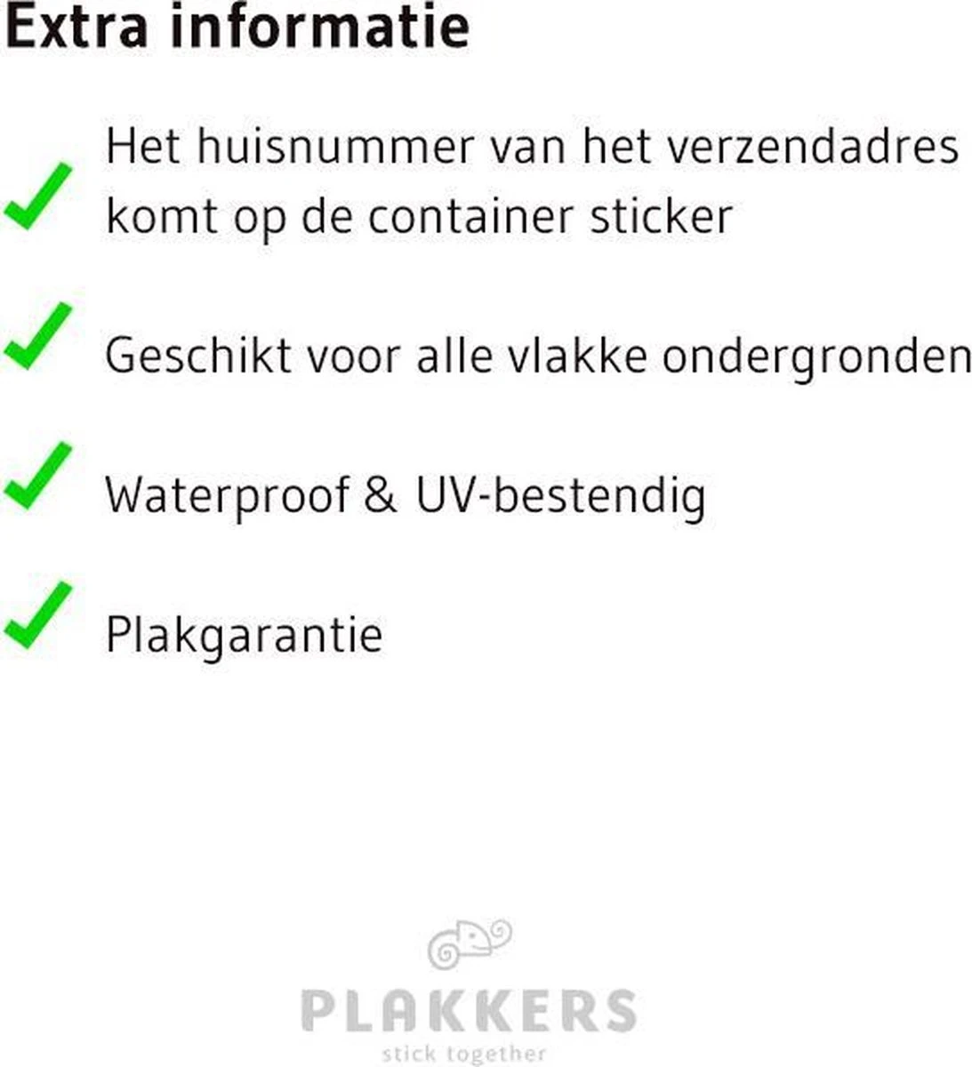 Ben je op zoek naar mooie containerstickers met jouw huisnummer? Deze weerbestendige stickers zijn eenvoudig op alle vlakke ondergronden aan te brengen. Kies uit wit of zwart, wij gebruiken het huisnummer van het bezorgadres.