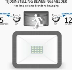 Deze ELRO LF60 LED straler beschikt over een handige instelbare bewegingssensor. Op deze sensor zitten 2 draaiknoppen om de instellingen van de lamp aan te passen. Met de ene draaiknop stel je in hoe lang de lamp moet branden na detectie. Met de andere draaiknop stel je de dag/nacht sensor in. Zo bepaal je hoe donker het moet zijn wanneer de lamp in werking treedt.