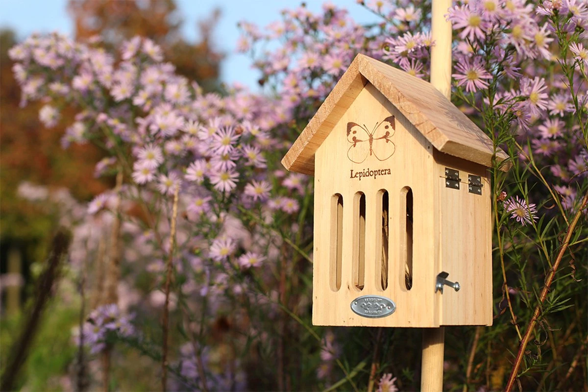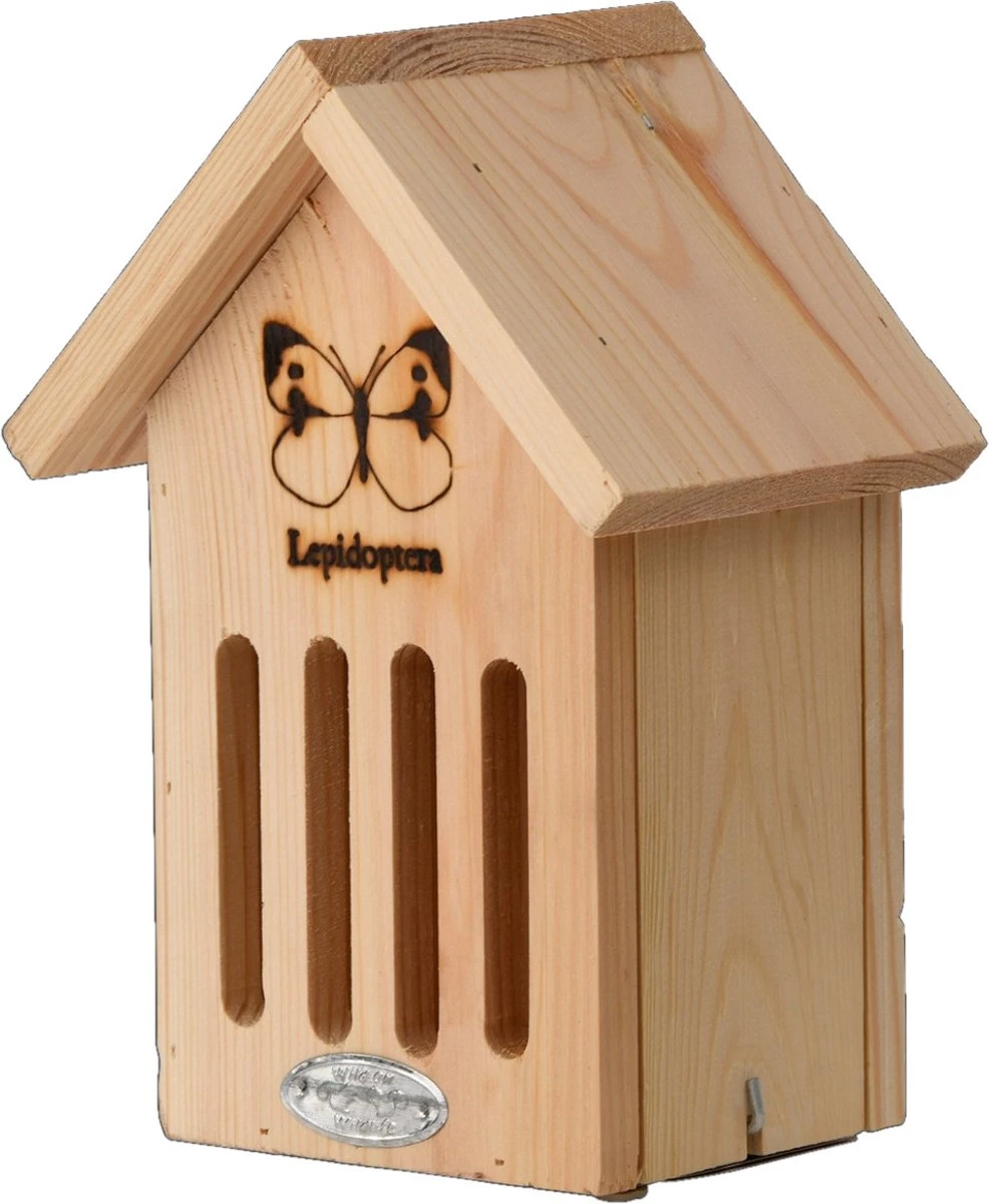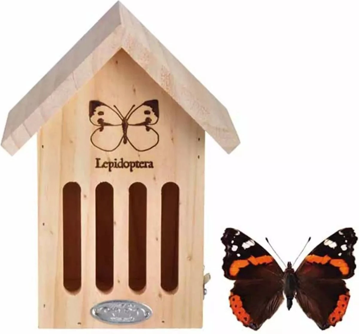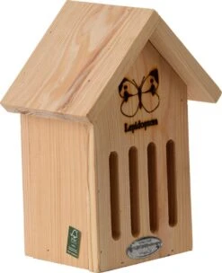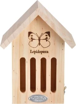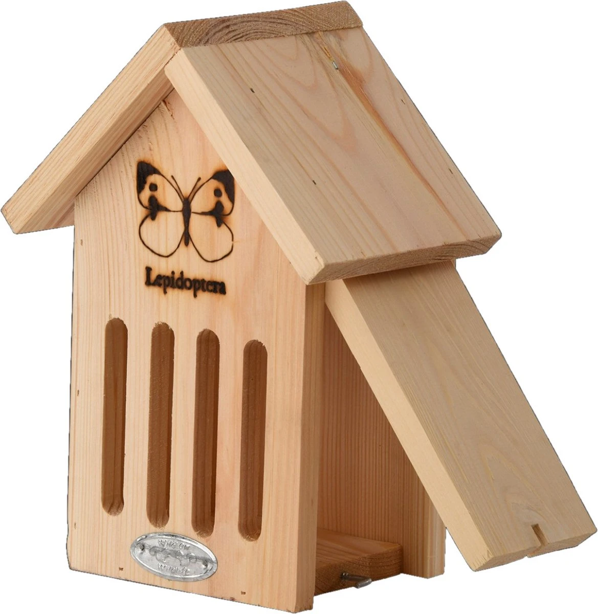 Op een mooie warme en zonnige zomerdag zie je overal vlinders vliegen. Op koude en natte dagen houden ze zich echter schuil. Deze kast biedt een ideale schuilplaats voor vlinders om bij nat weer in weg te kruipen. Om het de vlinders goed naar de zin te maken moet u een handvol twijgen in de kast proppen. Hieraan hangen de vlinders als zij van de kast gebruik maken.