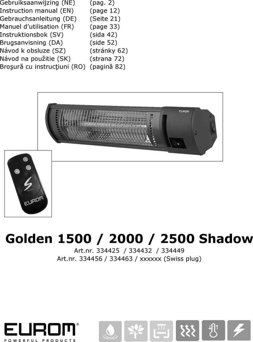 De Eurom Golden Shadow 1500 terrasverwarmer maakt buiten zitten comfortabel. De Golden Shadow lamp geeft namelijk nauwelijks licht af. Deze terrasverwarmer is op te hangen en is 115 graden zwenkbaar. Dankzij de 1500 Watt warmtekracht en de halogeen lampen wordt snel een aangename warmte bereikt op jouw terras of balkon. Deze Terras Heater is spatwaterdicht dus kan ook onder een luifel of parasol gemonteerd worden. Ook een belangrijk voordeel van deze Golden Shadow serie is de lage piekspanning bij het aanzetten.