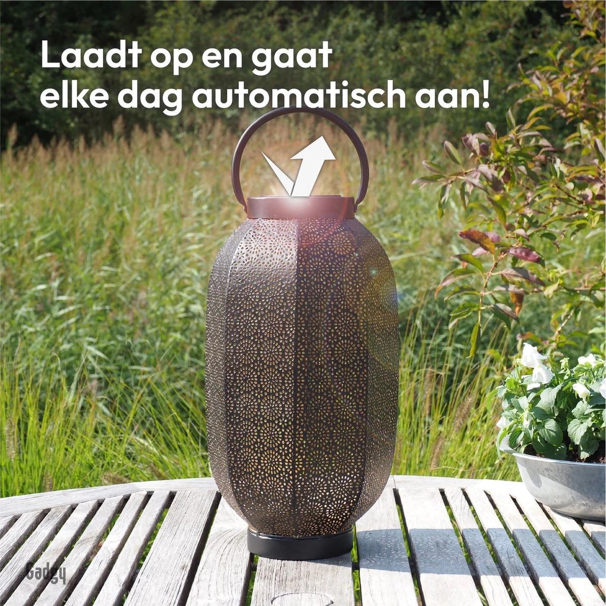 Opgeladen door zonlicht – De lantaarn wordt opgeladen door zonne-energie. Hierdoor heb je geen snoer of wegwerpbatterijen nodig en dit maakt deze verlichting makkelijk verplaatsbaar en duurzaam.