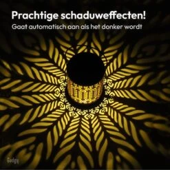 Gadgy Solar Tuinverlichting Pauwmotief bestaat uit een set van 2 schitterende lantaarns om jouw tuin mee te decoreren. De lantaarns zijn gemaakt van zwart metaal met een goudkleurige binnenkant, wat zorgt voor sfeervol warm licht in het donker. Het schitterende lichteffect met pauwmotief maakt deze lampen ’s avonds een echte eyecatcher. De lantaarns zijn spatwaterdicht, wat het de perfecte decoratie maakt voor buiten in de tuin. Ook leuk als cadeau voor iemand anders!
