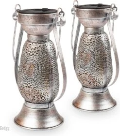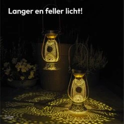 Deze set bestaat uit 2 schitterende tuinlampen voor buiten. Het uitgesneden Oriëntaalse patroon met schitterend lichteffect maakt deze lampen een echte eyecatcher in het donker. De lampen zijn geschikt voor op tafel en als hanglamp, door deze op te hangen aan het handvat. Leuk voor jezelf of als cadeau voor iemand anders!