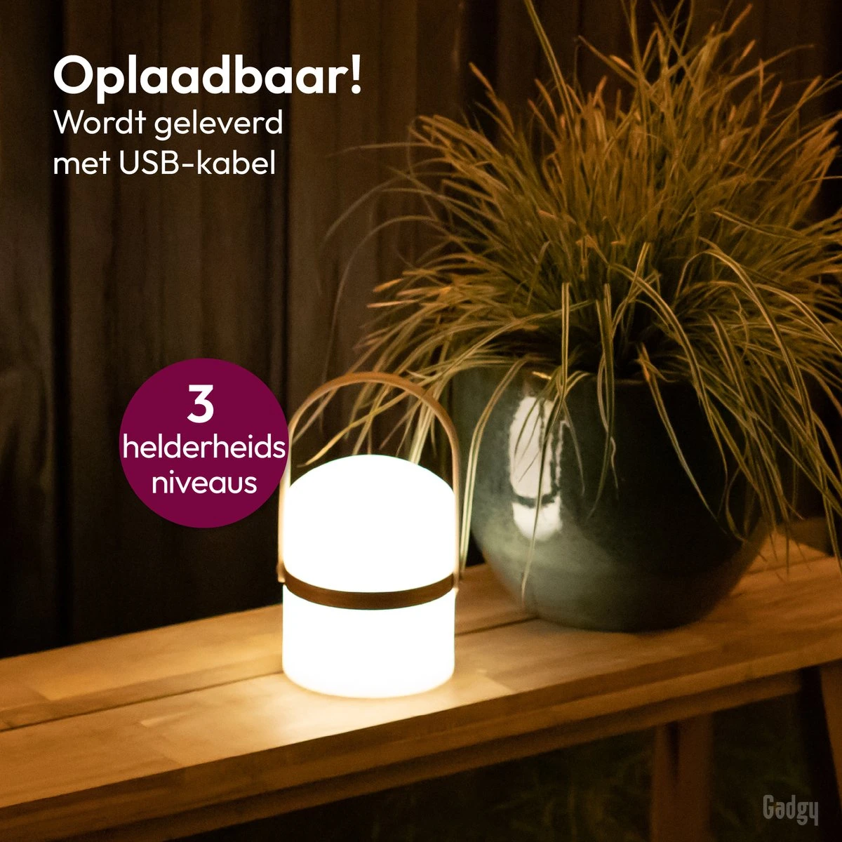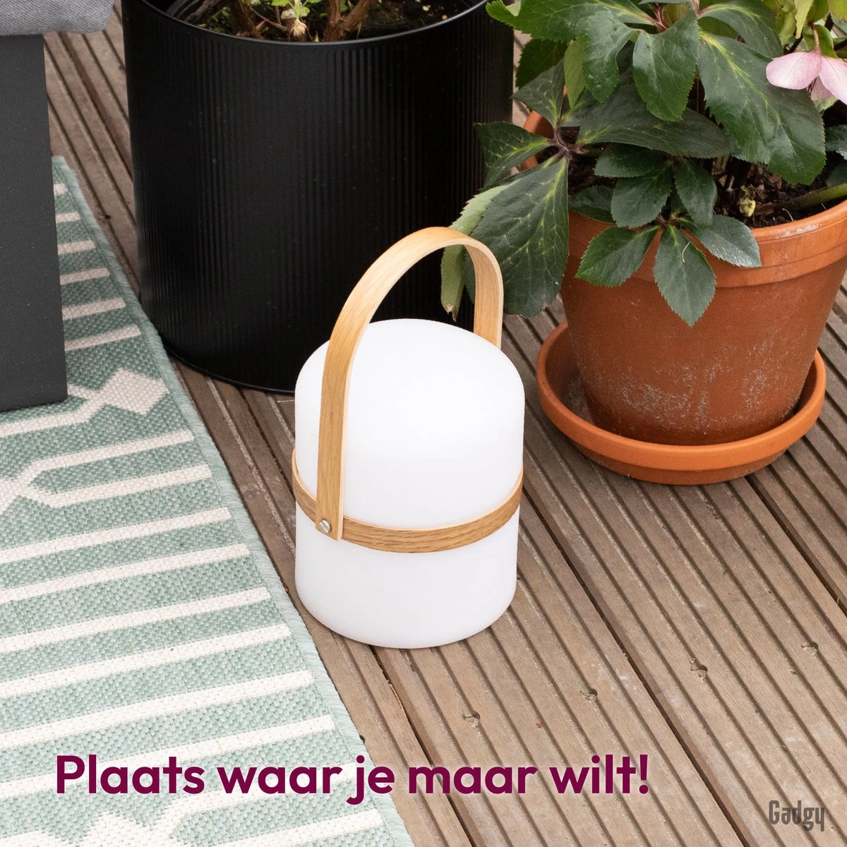 Geef meer sfeer aan je zomeravonden met deze fantastische lamp! Verlicht je huis, tuin of iedere andere plek buiten met deze mooie oplaadbare tafellamp van Gadgy. Het heeft een stevig handvat gemaakt van bamboe waaraan je de lamp overal mee naar toe kunt nemen en op kunt hangen waar je maar wilt. Volledig opgeladen brandt deze lamp wel tot 160 uur! Dat is veel langer dan ieder andere soortgelijke lamp. De lamp is daarbij ook nog dimbaar zodat het te gebruiken is als helder licht, maar ook te dimmen is tot een hele gezellige sfeerlamp. Ook handig om mee te nemen naar de camping of andere vakantie!
