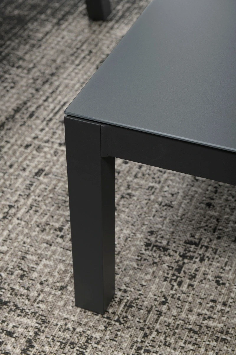 De set bestaat uit twee bankdelen en een tafel. Zowel de hoekbank als tafel hebben een aluminium frame. Hierop is een beschermende poedercoating aangebracht. Aluminium is sterk, weerbestendig en onderhoudsvriendelijk. De comfortabele loungekussens hebben een waterafstotende coating, wat er voor zorgt dat regenwater niet direct wordt opgenomen in de stof. Als de kussens niet worden gebruikt, wordt geadviseerd om deze droog op te bergen.