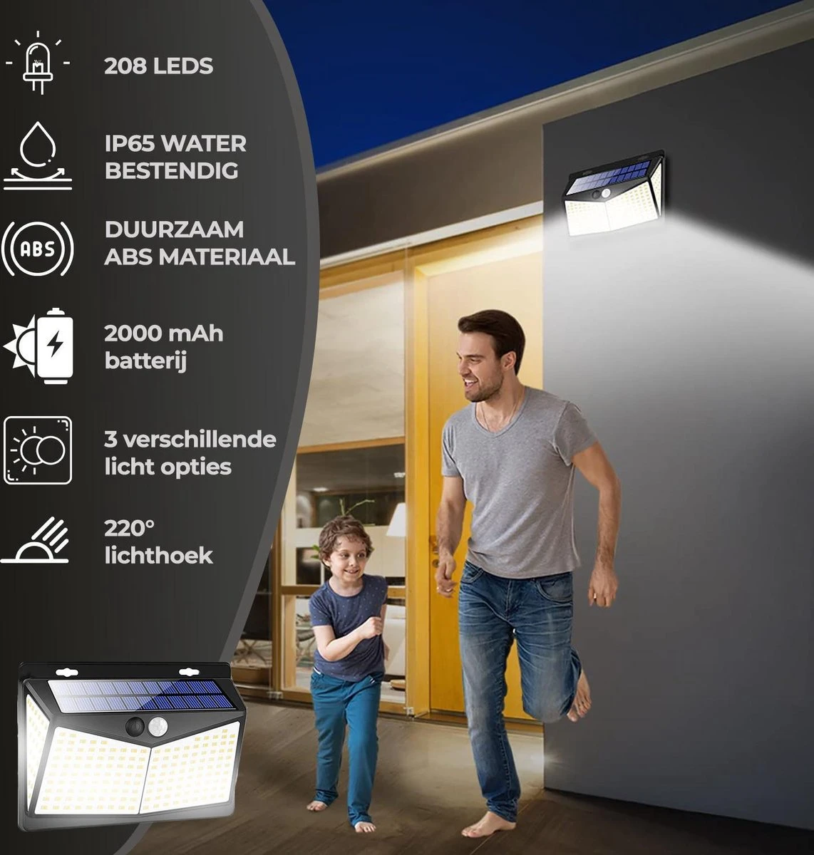 De op zonne energie opgeladen buitenlamp beschikt over 208 felle LED lampen die er voor zorgen dat jouw hele tuin, oprit of voordeur verlicht wordt. De lamp kan worden ingesteld op drie verschillende standen die een hulp bieden in elke situatie. Door het innovatieve driezijdige design heeft de lamp een groot licht bereik van wel 30 vierkante meter, in een hoek van 270 graden.