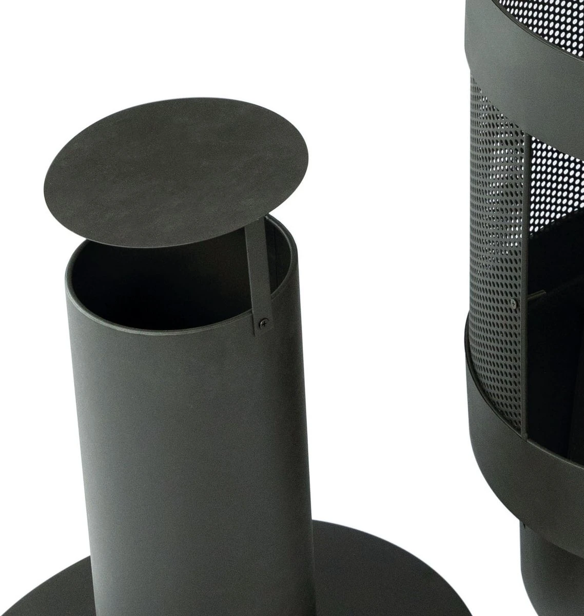 De schoorsteen zorgt ervoor dat de rook perfect wordt afgevoerd en is voorzien van een regenkap waardoor inregenen voorkomen wordt. Onder de haard is genoeg plek om bandhout op te slaan.
