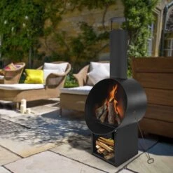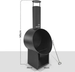 De trendy ronde haard met houtopslag is een eye-catcher in iedere tuin. Door zijn unieke uiterlijk valt hij op, maar door zijn zwarte gepoedercoate buitenkant past hij toch overal tussen.