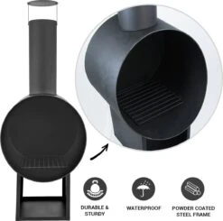 Met zijn stevig onderstel staat hij robuust in je tuin, daarnaast is de haard voorzien van een handig opbergvak voor houtblokken. Niet alleen leuk voor het oog, maar ook zeer praktisch. Aan de binnenkant van de tuinhaard is een extra rekje gemonteerd voor het opbranden van houtblokken en het beschermen van de onderplaat. Zo gaat je tuinhaard nog langer mee. De schoorsteen zorgt ervoor dat de rook perfect wordt afgevoerd en is voorzien van een regenkap waardoor inregenen voorkomen wordt.