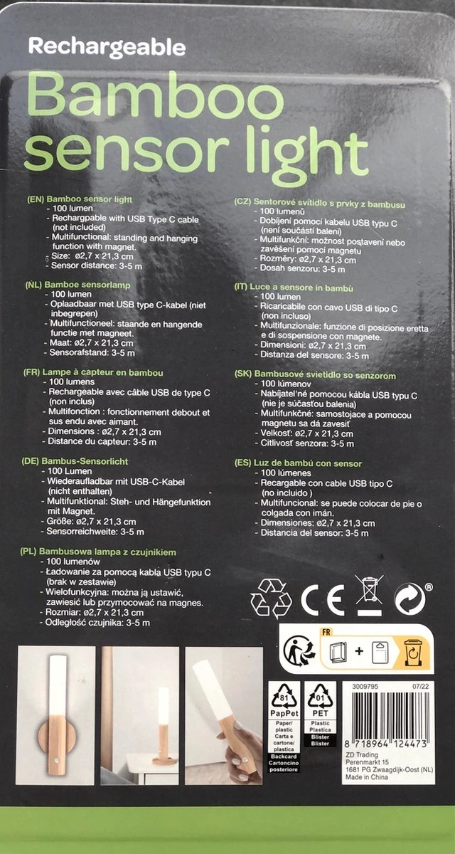 Merkloos Bamboo Sensor Licht 100 Lumen-rechargeable – Bamboo Sensor Light 100 Lumens Rechargeable