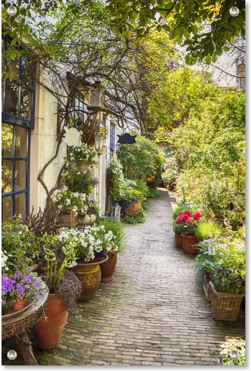 Tuinposter Bloemensteeg kan binnenkort de show stelen in de tuin of op de balkon. Deze tuinschilderij is een trendy eyecatcher tegen de schutting in tuin of balkon, want de poster voor buiten kan op iedere plek net dat beetje extra geven. De tuinposter kan zowel binnen als buiten worden opgehangen. Uw inrichting kan hierdoor nog meer in het oog springen in combinatie met uw tuinmeubels of andere tuinaccessoires.