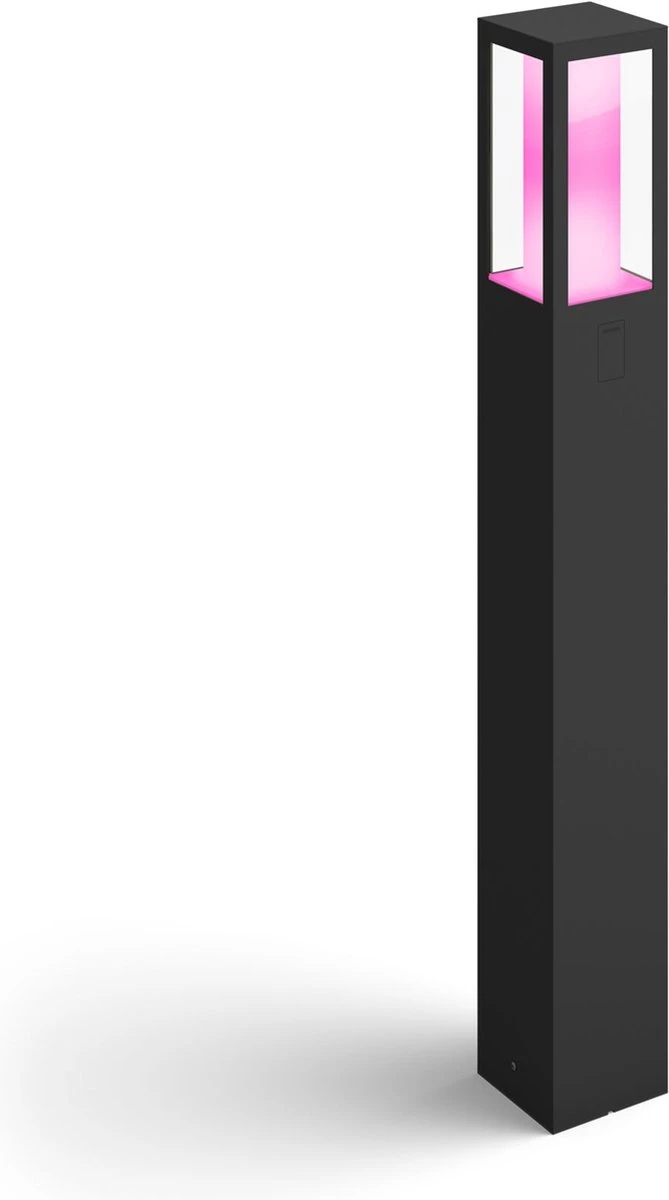 De strakke vormgeving van de hoge zwarte Philips Hue Impress White and color ambiance sokkellamp past in allerlei buitenomgevingen. De ingebouwde LED-verlichting achter de glazen panelen levert licht in 16 miljoen kleuren en laat zich eenvoudig bedienen als je de lamp verbindt met een Philips Hue Bridge. Via de Philips Hue app op je smartphone of tablet beschik je dan over tal van slimme lichtfuncties zoals bediening op afstand (als je niet thuis bent), timers en geofencing-technologie. Dat betekent dat de buitenverlichting automatisch aangaat als je je huis nadert. De lamp is bovendien weerbestendig met een IP44-classificatie, dus je hoeft je geen zorgen te maken over regen en wind.