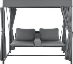 Het elegante schommelbed Kassandra is het nieuwe middelpunt van je tuin om je voeten op te leggen en te genieten van de zomer. Ontworpen in de stijl van een Balinees bed, zorgt het voor ontspannen schommelen dankzij het vrij hangende ligvlak. Modern en exotisch, zoals op vakantie in de Stille Zuidzee, zal deze tuinligstoel een blikvanger zijn in elke wellness-oase. Het dak en de gordijnen aan weerszijden zorgen voor veel privacy en beschermen tegelijkertijd tegen te veel zon en lichte wind. Ontworpen voor 2 personen, kunt u samen ontsnappen aan het dagelijkse leven en wegzweven als op wolken.