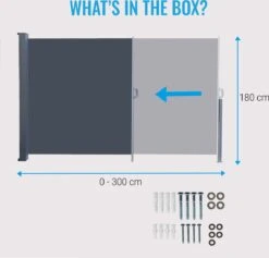 Het windscherm is 180 cm hoog en uitgerold heeft een lengte van maximaal 300 cm lang. Het doek van het uitrolbare windscherm is gemaakt van polyester. Het is beschermd met een UV-coating en een PU-coating die het windscherm volledig weersbestendig maakt. De palen zijn gemaakt van metaal. Het uitrolbare windscherm weegt 7.3kg.