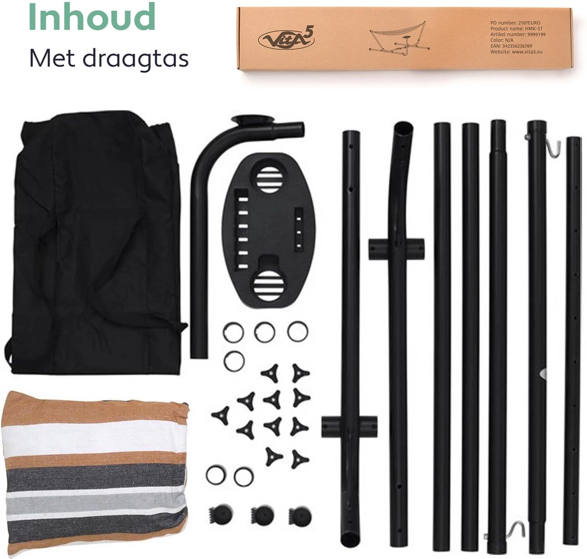 Vita5 Hangmat Met Standaard – 2 Persoons – Incl. Bekerhouder – 205kg Draaggewicht – Blauw/Wit/Bruin